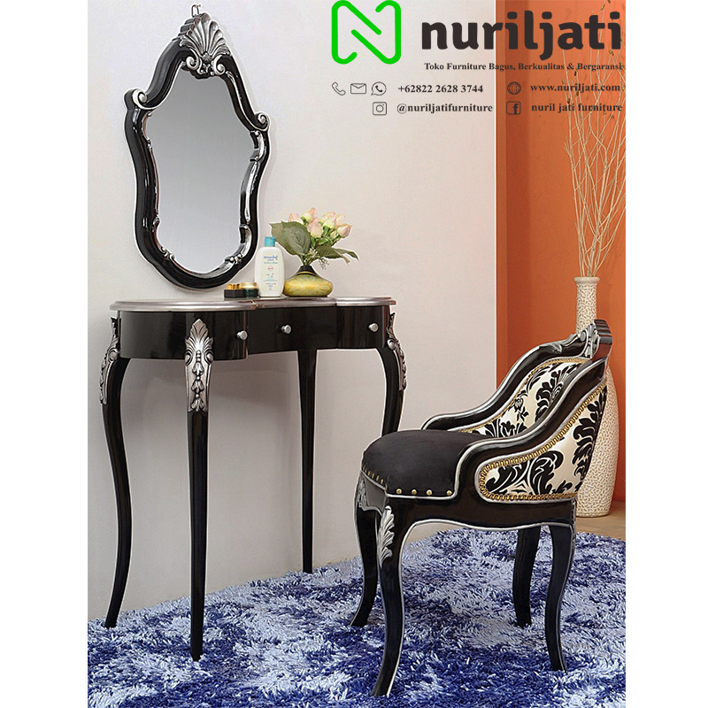 Desain meja rias ukir duco ini salah satu model meja rias dengan desain klasik mewah terbaru asli Nuril Jati Furniture yang sangat cocok untuk melengkapi interior perabotan rumah mewah anda dengan adanya produk meja rias minimalis yang sangat bagus dan berkualitas export ini, karena meja rias duco ini terbuat dari bahan kayu perhutani GRADE A TPK yang dikerjakan langsung pengrajin mebel jepara kami yang handal dan berpengalaman dalam bidangnya dengan menggunakan mesin modern sehingga menghasilkan meja rias ukir duco mewah ini berkualitas dan berkelas tinggi, set meja rias jati mewah model terbaru ini bisa anda pesan dengan sangat mudah hanya di toko mebel online kami pastinya dengan harga yang terjangkau dan barang berkualitas.