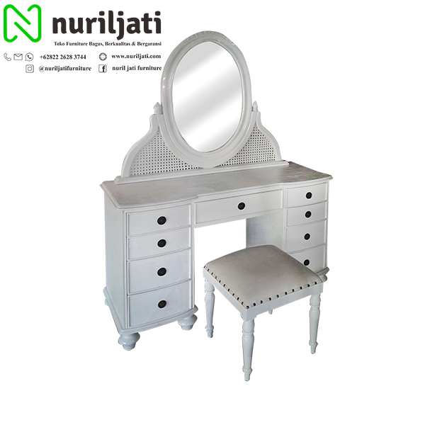 Meja Rias Syabby Duco Putih 025 ini diproduksi dengan menggunakan material kayu jati pilihan berkualitas kategori TPK Gread A yang kami produksi langsung di workshoop kami Jepara dengan dikerjakan oleh tenaga tukang kayu mebel Jepara profesional yang ada diperusahaan kami Nuril Jati Furniture Jepara. Kontruksi saat memproduksi meja rias ukir mewah custom desain ini menjadi salah satu hal yang paling kami prioritaskan untuk kemewahan & kenyamanannya, karena dari tingkat kekuatan kontruksi yang bagus produk tersebut baru bisa dikatakan berkualitas juga pemakaian jangka panjang.
