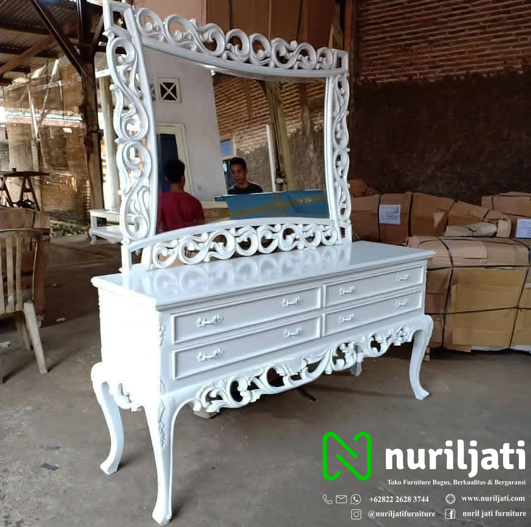 Meja Rias Ukir ini salah satu produksi mebel ukir interior untuk ruang kamar anda dengan menggunakan model duco putih ukiran mewah khas jepara terbaru dengan menyesuaikan trend era furniture meja rias saat ini. Meja rias ukir berkualitas ini merupakan salah satu produk interior premium klass untuk ruang kamar anda yang paling populer saat ini.