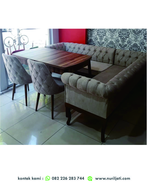 Sangat ideal untuk ruangan yang ingin memaksimalkan tempat duduk di salah satu sudut. Set kursi tamu minimalis model L ini menghilangkan kebutuhan akan kursi-kursi tunggal yang bisa memecah visual ruangan.